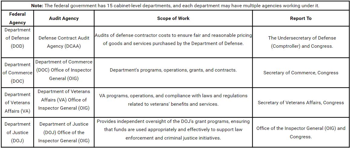 Chief Financial Officers (CFO) Act of 1990 requires 24 major federal agencies to have annual financial statement audits. The following table shows the federal auditing agencies of each department, including the difference between the scope of each agency and who they report to: